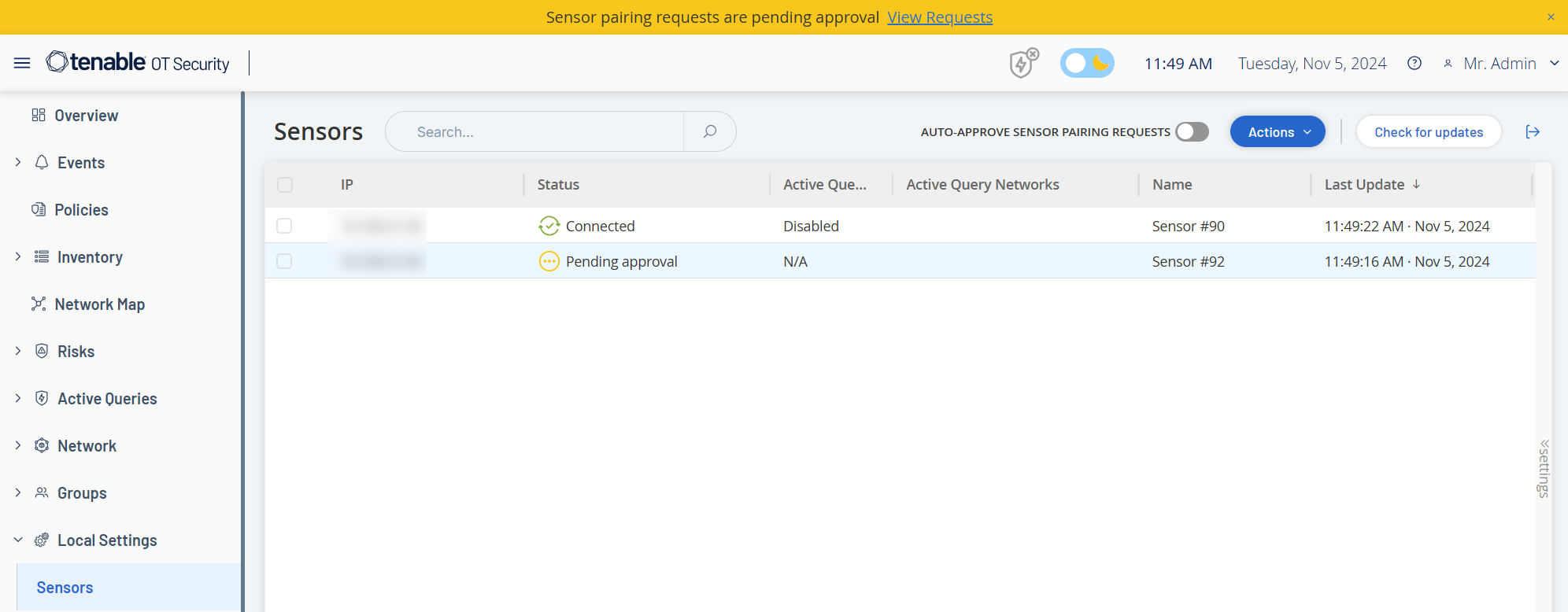 OT Security aktualisiert die ausgewählten Sensoren.