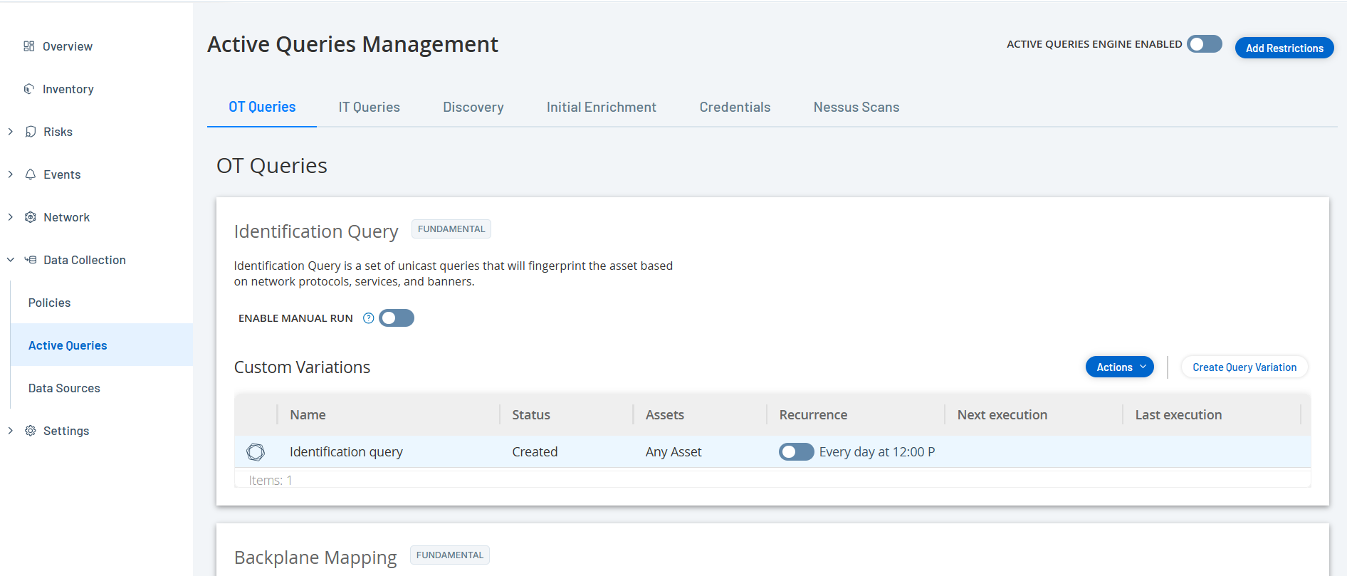 Tipp: Damit aktive Abfragen funktionieren, klicken Sie auf den Umschalter Engine für aktive Abfragen ist aktiviert. Nachdem Sie die aktiven Abfragen aktiviert haben, zeigt OT Security das Symbol  in der Kopfzeile an, um anzuzeigen, dass die Engine für aktive Abfragen ausgeführt wird. Um aktive Abfragen auszuführen, müssen Sie trotzdem jede einzelne Abfrage separat aktivieren.
