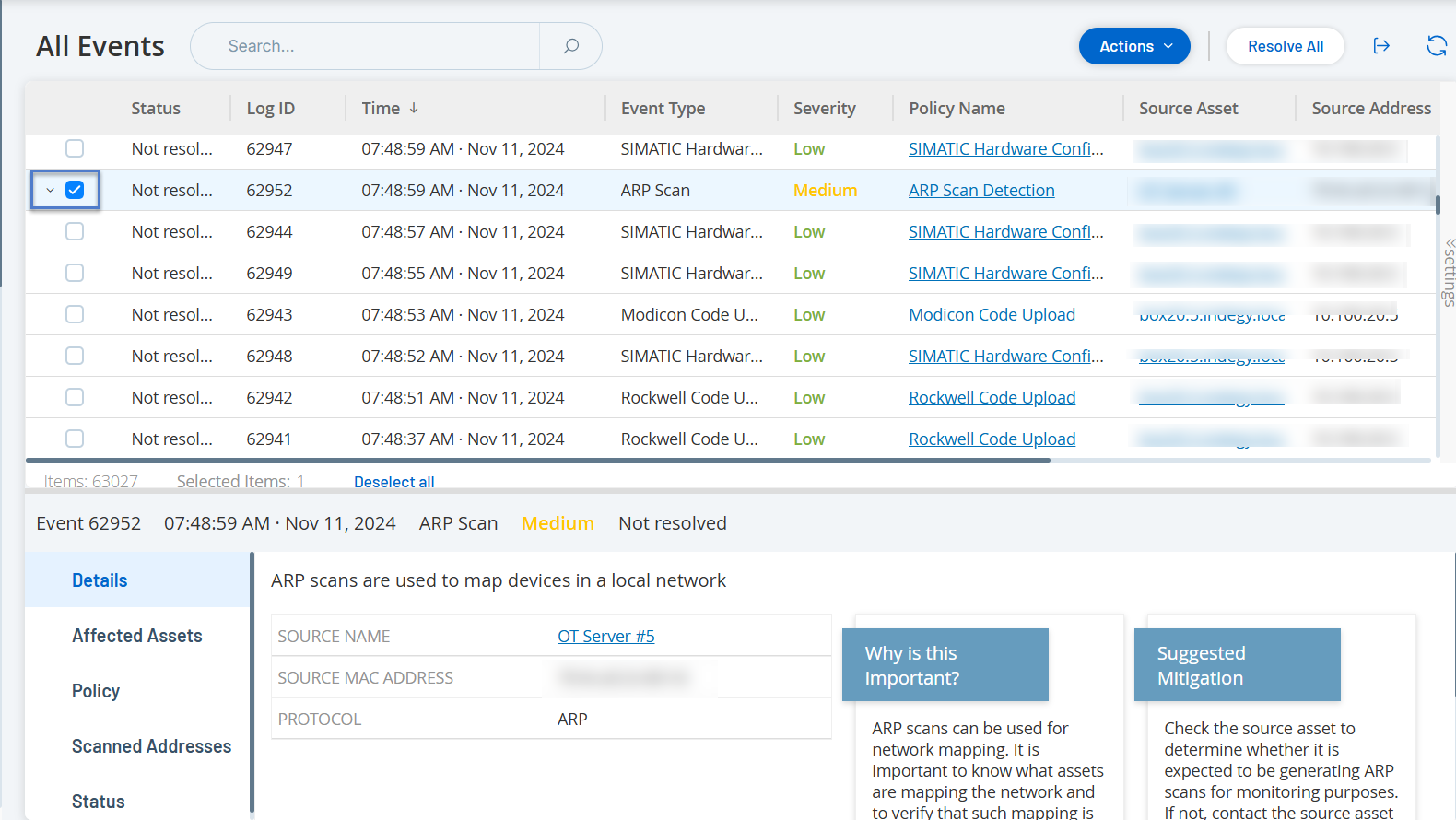 Alle Ereignisse, die im System aufgetreten sind, werden auf der Seite Alle Ereignisse angezeigt. Spezifische Untergruppen der Ereignisse werden in separaten Fenstern für jede dieser Ereigniskategorien angezeigt: Konfigurationsereignisse, SCADA-Ereignisse, Netzwerkbedrohungen und Netzwerkereignisse.