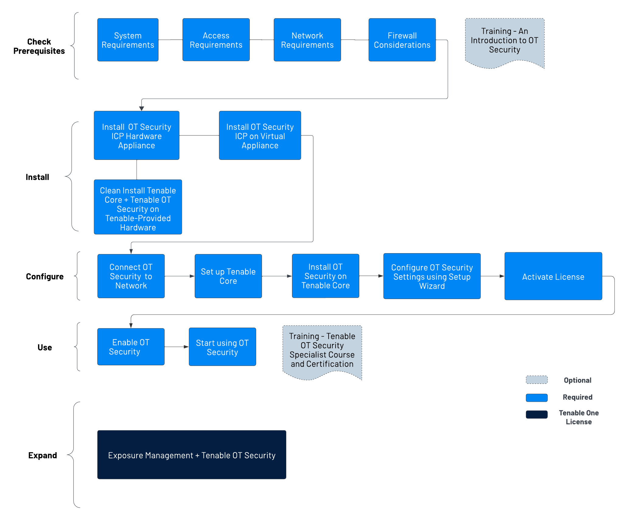 - OT Security ICP-Hardware-Appliance installieren – Richten Sie OT Security als Hardware-Appliance ein.Hinweis: Auf der von Tenable bereitgestellten Tenable Core-Hardware ist Tenable Core + OT Security vorinstalliert. Wenn Sie eine ältere oder veraltete Appliance installieren, sollten Sie sich möglicherweise für eine Neuinstallation entscheiden. Weitere Informationen finden Sie unter Neuinstallation von Tenable Core + Tenable OT Security auf von Tenable bereitgestellter Hardware.