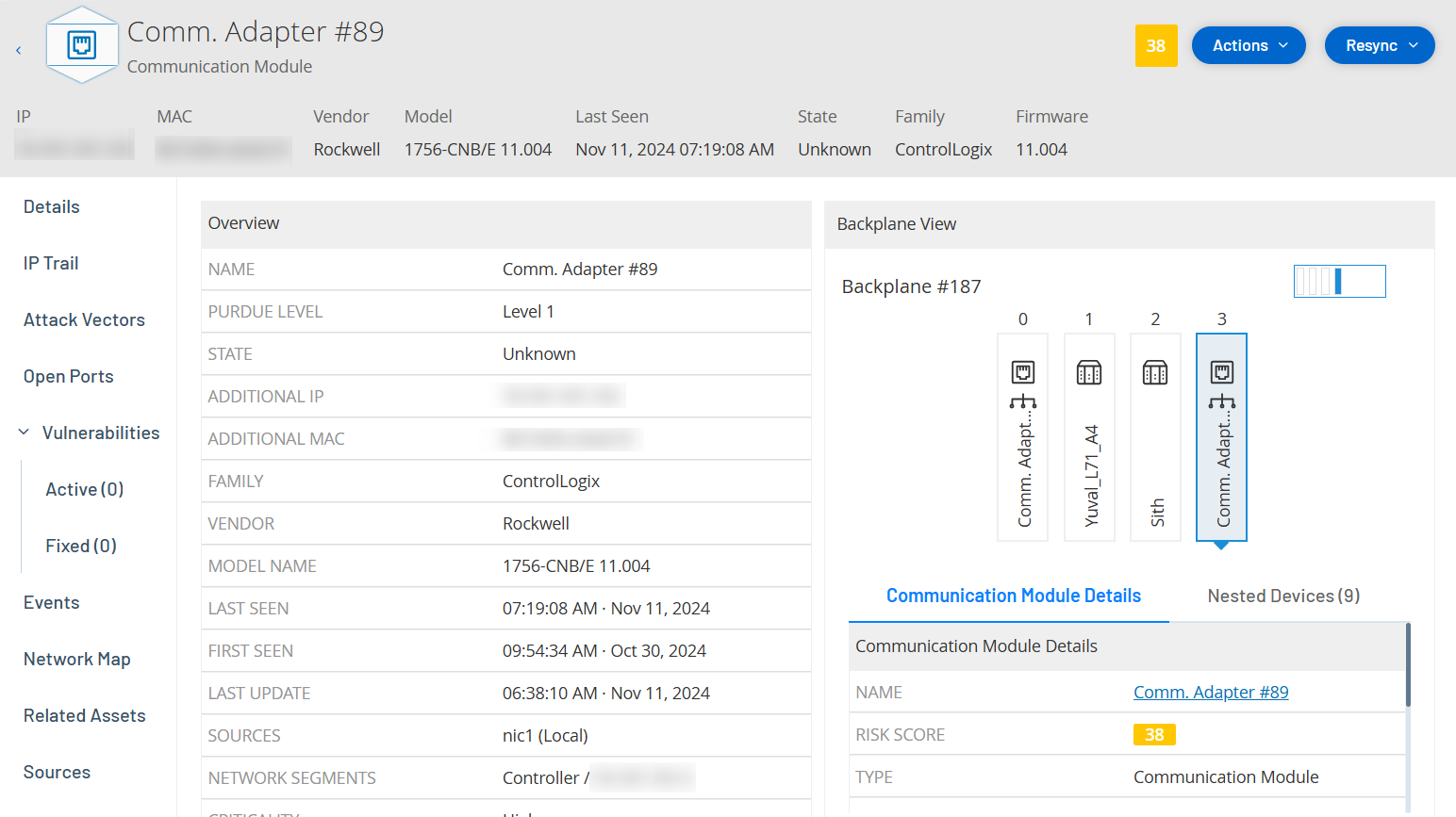 Verschachtelte Geräte sind speicherprogrammierbare Steuerungen (SPS) oder andere ICS-Module (Industrial Control System, industrielles Steuerungssystem), die hinter einer SPS-Backplane oder einem Gerät angeschlossen sind. Dies ist vergleichbar mit einem Frequenzumrichter (Variable-Frequency Drive, VFD), der direkt an einen Kommunikationsadapter angeschlossen ist. Um die Details eines verschachtelten Assets anzuzeigen, klicken Sie auf der Seite Verwandte Assets auf den Link zum verschachtelten Asset. OT Security zeigt verschachtelte Geräte mit dem Symbol  an.