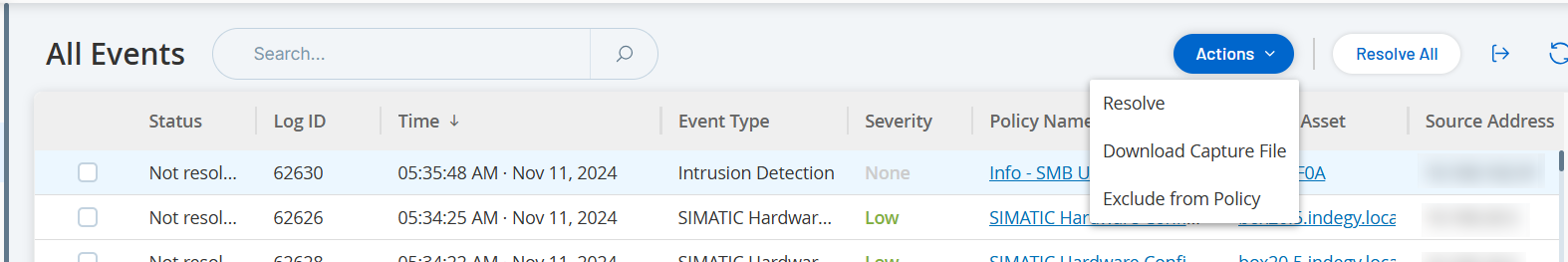 Jeder Bildschirm verfügt über eine Reihe von Aktionen, die Sie für die auf diesem Bildschirm aufgeführten Elemente ausführen können. Beispielsweise können Sie im Bildschirm Richtlinien die Aktionen Anzeigen, Bearbeiten, Duplizieren oder Löschen für eine Richtlinie ausführen. Im Bildschirm Ereignisse können Sie für ein Ereignis die Aktionen Auflösen oder Erfassungsdatei herunterladen ausführen.