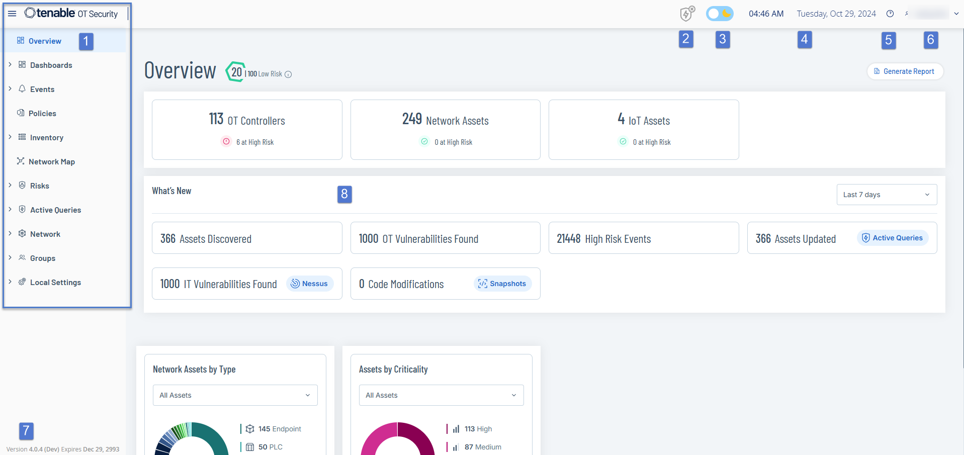 • Übersicht – Zeigt Widgets an, die einen allgemeinen Überblick über das Inventar und die Sicherheitslage Ihres Netzwerks geben. Siehe OT Security – Übersicht.