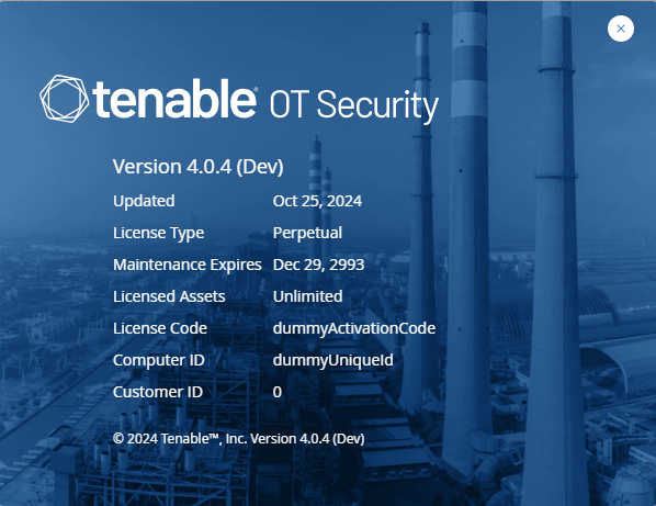 Nachdem Sie OT Security aktiviert haben, können Sie Ihre Tenable-Kunden-ID in der Ansicht Info einsehen. Diese Kunden-ID ist erforderlich, wenn Sie sich an den technischen Support oder das Customer Success-Team wenden.