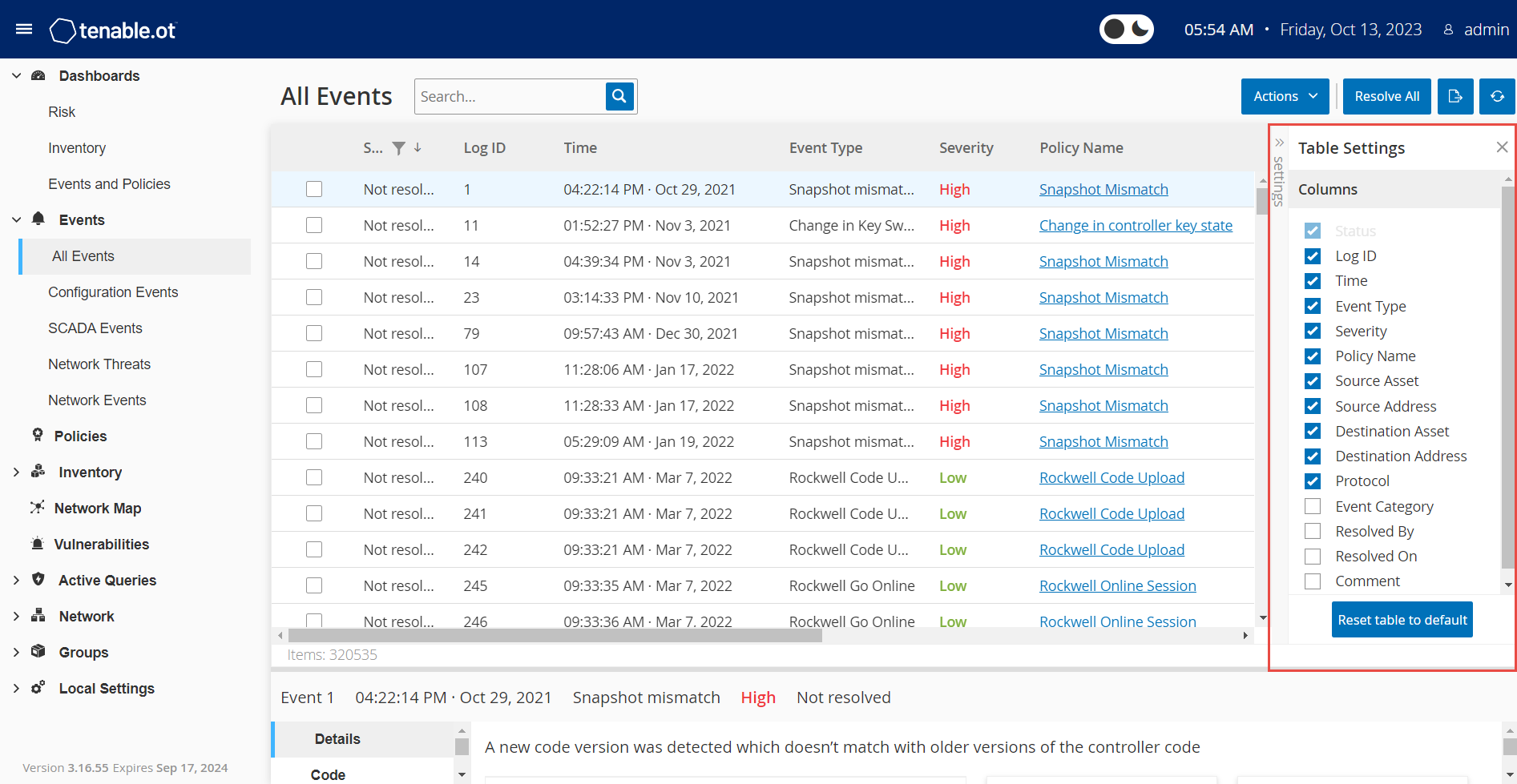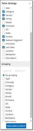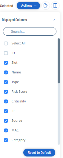, um den Bereich Angezeigte Spalten zu schließen.OT Security zeigt nur die ausgewählten Spalten an.