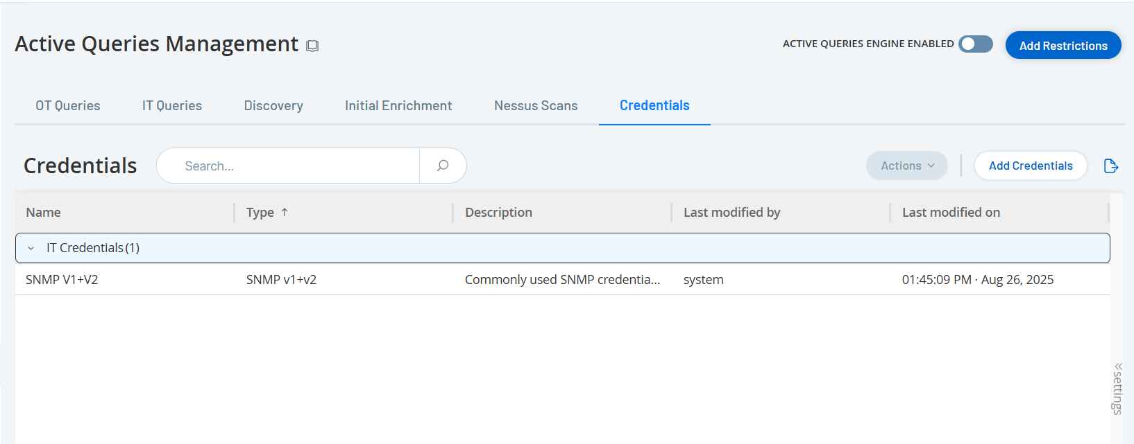 Verwenden Sie die Seite Zugangsdaten, um bei Bedarf die Zugangsdaten für das Gerät zu konfigurieren. Für die Kommunikation in ihren nativen Netzwerkprotokollen oder proprietären Protokollen benötigen Geräte keine Zugangsdaten. Für bestimmte Geräte, die von OT Security unterstützt werden, sind jedoch möglicherweise Zugangsdaten erforderlich, um die Asset-Erfassung durchzuführen.