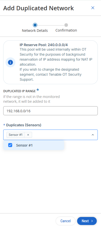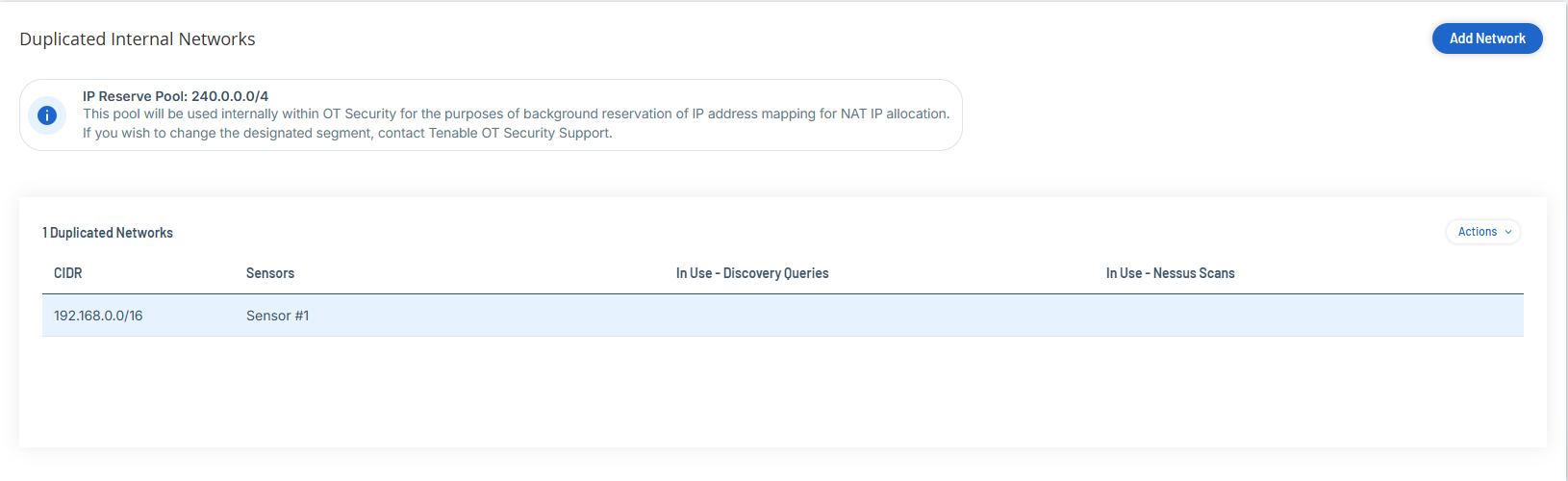 Hinweis: OT Security verwendet den IP-Bereich 240.0.0.0/4 als internen Reservepool für die Zuordnung von IP-Adressen zur NAT-IP-Zuteilung. Um diesen Reservepoolbereich zu ändern, wenden Sie sich an Tenable Support. -