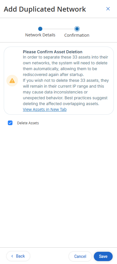 Tipp: Um alle ausgewählten Assets in ihre eigenen Netzwerke aufzuteilen, empfiehlt Tenable, dass Sie OT Security erlauben, die Assets zu löschen und nach dem Start erneut zu erfassen. Wenn Sie das Kontrollkästchen Assets löschen nicht aktivieren, verbleiben die Assets in ihrem aktuellen IP-Bereich, was zu Inkonsistenzen oder unerwartetem Verhalten führen kann. -