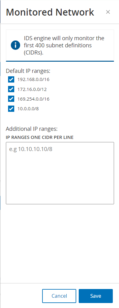 Die Konfiguration des überwachten Netzwerks enthält eine Reihe von IP-Bereichen (CIDRs/Subnetze), die die Überwachungsgrenzen für OT Security definieren. OT Security ignoriert Assets außerhalb der konfigurierten Bereiche.