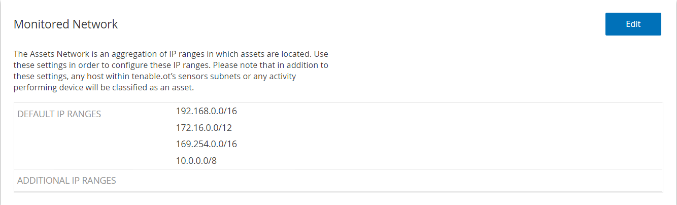Standardmäßig konfiguriert OT Security drei öffentliche Standardbereiche: 10.0.0.0/8, 172.16.0.0/12 und 192.168.0.0/16 sowie den Link-Local-Bereich 169.254.0.0/16 (APIPA).