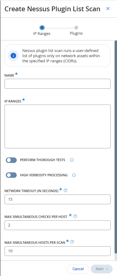 Der Nessus-Plugin-Scan startet einen erweiterten Nessus-Scan, der eine benutzerdefinierte Liste von Plugins für die Assets ausführt, die in der Liste der CIDRs und IP-Adressen angegeben sind.