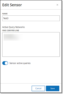 Hinweis: Abfragen können nur für CIDRs durchgeführt werden, die in den überwachten Netzwerkbereichen enthalten sind. Stellen Sie sicher, dass Sie nur CIDRs hinzufügen, auf die über diesen Sensor zugegriffen werden kann. Das Hinzufügen nicht zugänglicher CIDRs kann sich auf die Abfragemöglichkeiten der ICP über andere Mittel auswirken.Hinweis: Wenn der Sensor Teil eines duplizierten Netzwerks ist, wird der IP-Bereich des duplizierten Netzwerks im Feld Aktive Abfragenetzwerke angezeigt und kann nicht bearbeitet werden. -